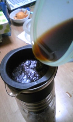 ⑥一旦ストレナーを取り出し(粉は捨てない)、寝かせたアイスコーヒーをタッパ(別の容器)に入れる。